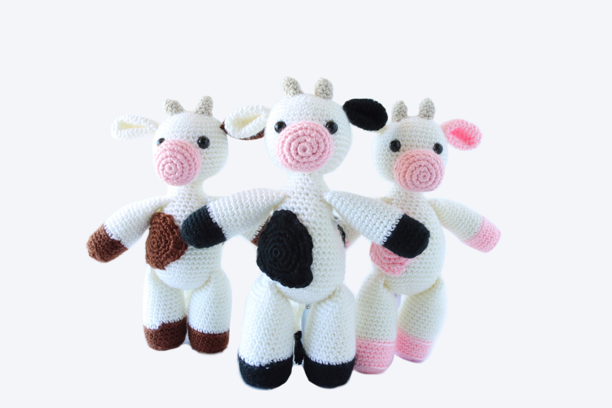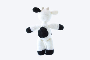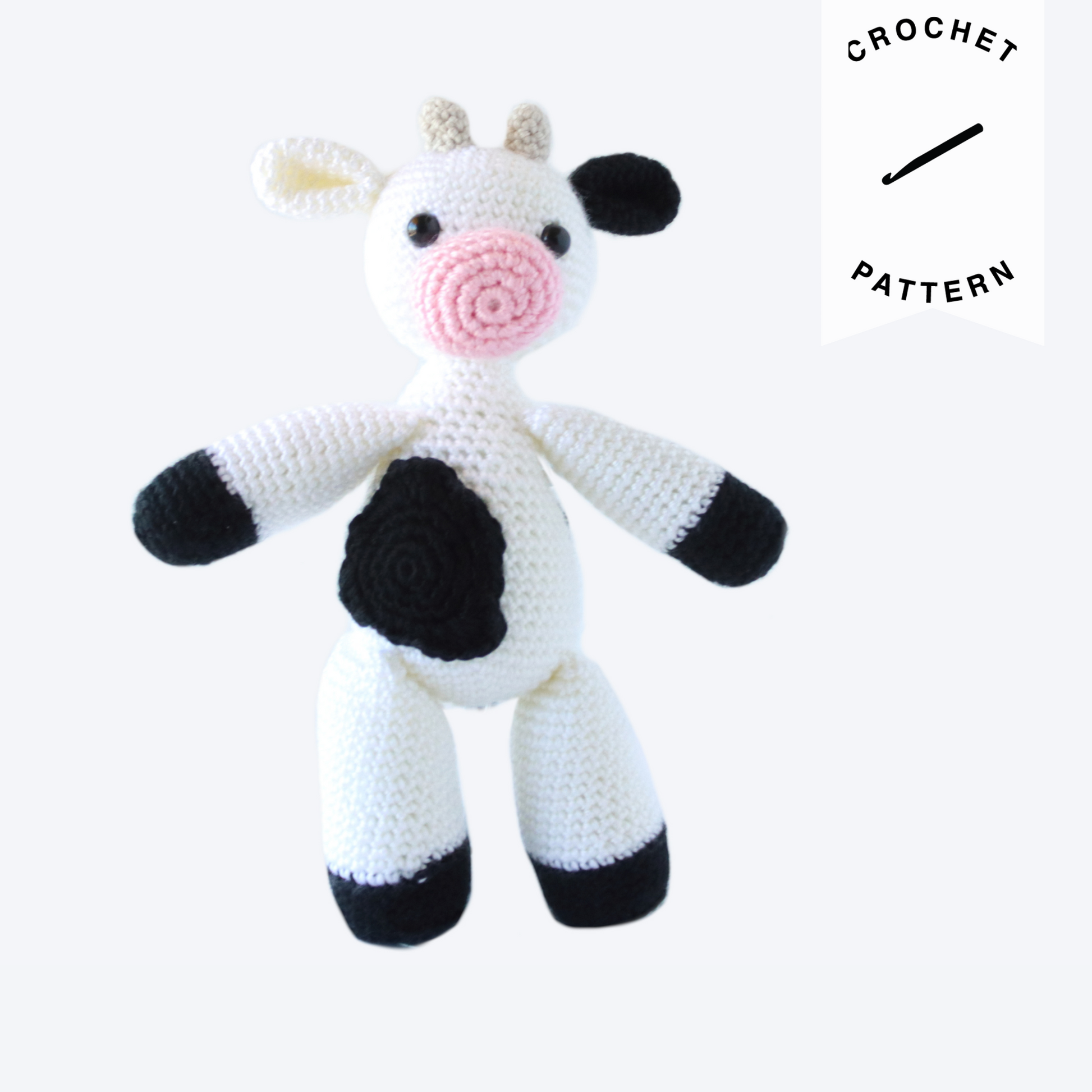 This is Bonnie the Cow, and she's such a fun and easy pattern to make! This crochet cow plushie can be made with the traditional black and white, or you can use brown and pink yarn for the strawberry cow and chocolate cow too! This is a pattern that's great for beginners, it uses mostly simple stitch lie single crochet to work the pieces, and then it's all seamed together at the end.