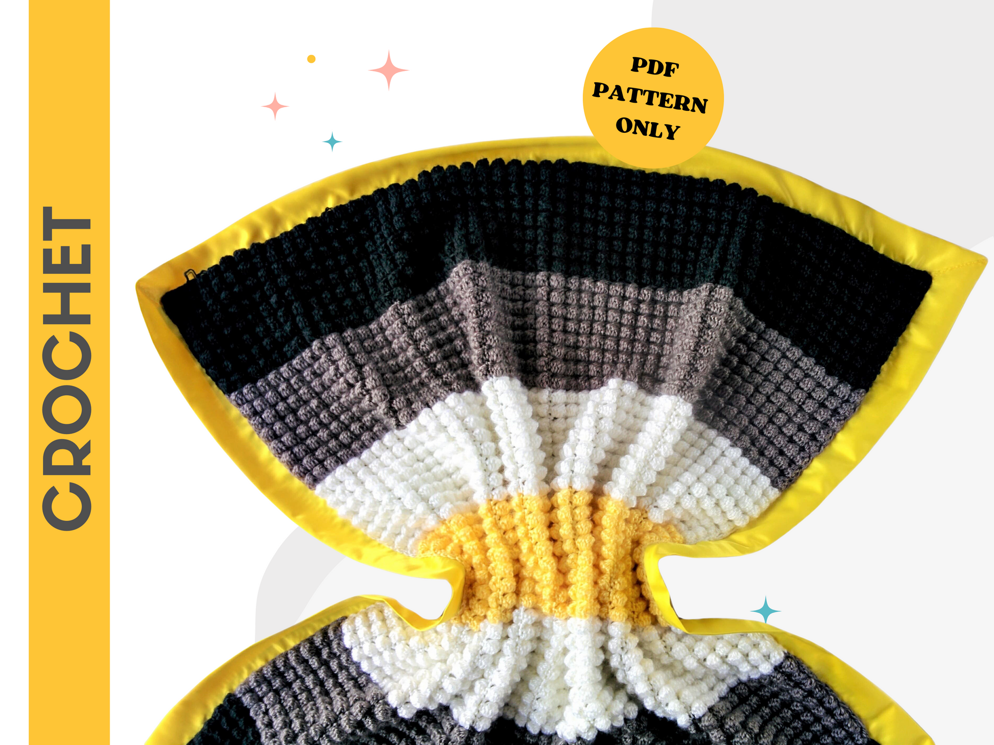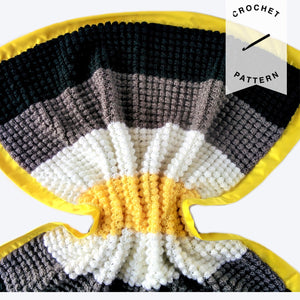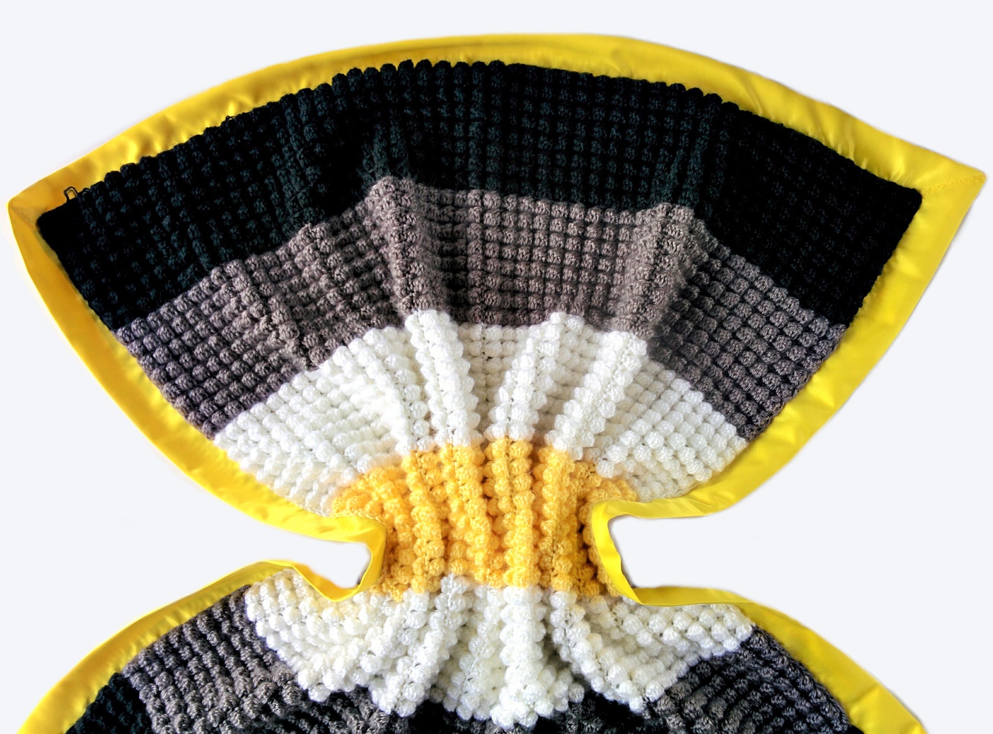 This is a crochet pattern for a bobble baby blanket with a satin border. The texture of this thing is amazing. Seriously, I wish you could feel how soft these bobbles are, perfect for little fingers to run through them. The yellow was something I added for a little pop of color in the blanket; it’s a happy color that works for little boys and girls. As always, I added a fleece lining (which is covered in little stars!) to finish it off and make it even more snuggly. The name is a bit of a tongue twister but the pattern is SO simple. This crochet pattern will have you making your own bobble blanket for your star in no time!