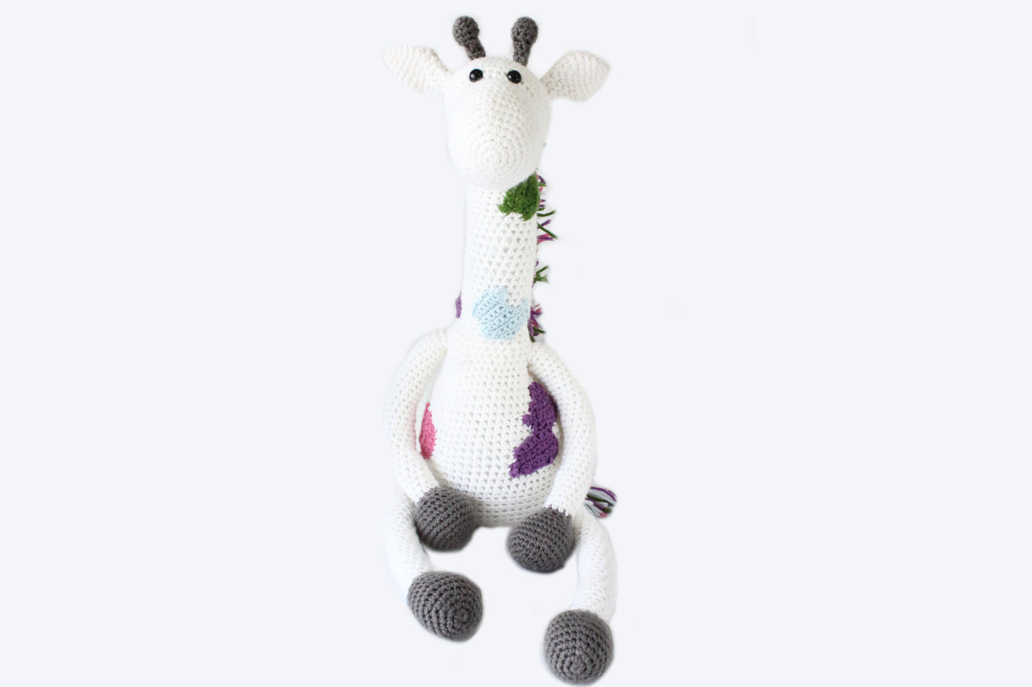 Jeremy the Giraffe sits at just under 2 feet tall and if you count his legs, he's a full three feet long! When I sat down to design this giraffe amigurumi pattern, I really wanted to get the legs right. I wanted the legs on my crochet giraffe to be pretty long and bobbly at the ends so that when you picked him up or wiggled him around, his arms and legs would swing around. A few years ago, I had done that with a monster toy, and it was so much fun for the kids to play with that wanted to include it here too. I also made it so Jeremy would sit on the base of his body and his arms and legs would be long enough to hang off a shelf or sit in a chair.