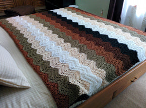 This pattern is just a simple chevron design that’s easy to replicate, and you can make it in any size you like, but the finished item from this pattern is 6.5 x 7 feet. It fits a queen-sized bed. This throw uses only half double crochets (HDCs) to make, and it’s very easy to get the chevron design. I used warm, earthy colors for this Mocha Ripple Throw, but you can easily change out the colors for a different look.