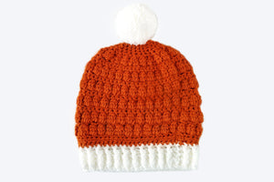 This Pumpkin Spice beanie is inspired by Fall and the warmth and comfort of your favorite treats. This is the crochet pattern for a textured slouchy hat that works up quickly and is constructed using variations of simple stitches. While you can of course make this in any color, the burnt orange color really brings out the colors in Fall and would go with any outfit. The beanie features a very stretchy ribbing and a reversible stitch pattern that looks great either way you choose to wear it. Or, you can pick your favorite and add a pom to make that the finished look. The pattern is available as a downloadable PDF.