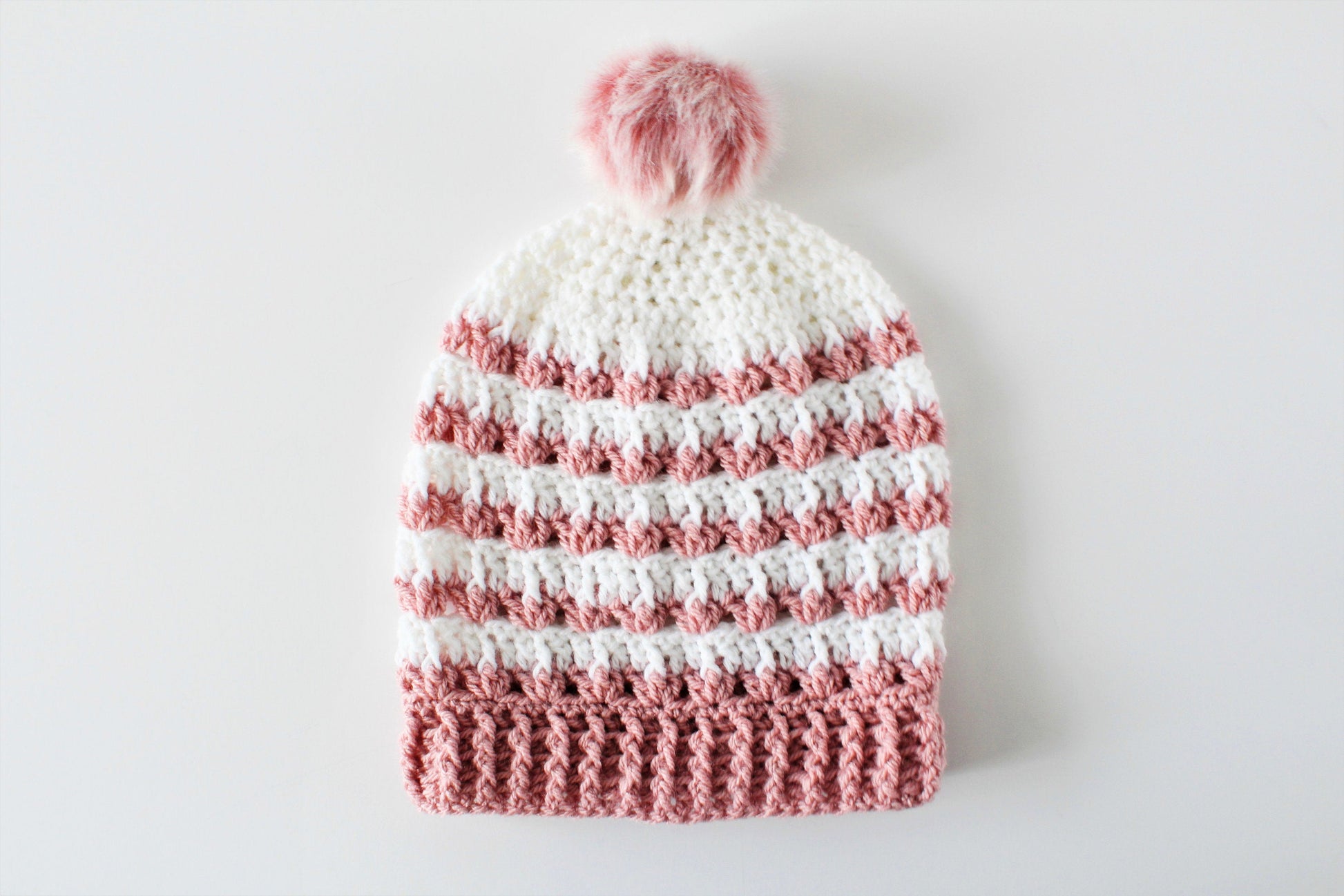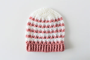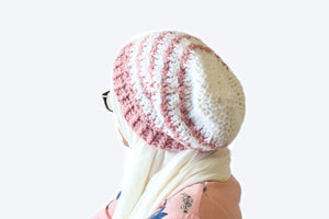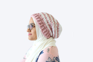 This Rosebud slouchy beanie is inspired by Spring and the color of new blooms. This is the crochet pattern for a textured slouchy hat that works up quickly and is constructed using variations of simple stitches. While you can, of course, make this in any color, the dusty pink really brings out the colors in Spring and would go with any outfit. The beanie features a very stretchy ribbing and a pretty textured stitch pattern. Or, you can pick your favorite and add a pom to make that the finished look.