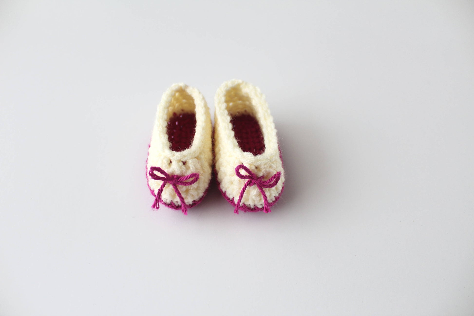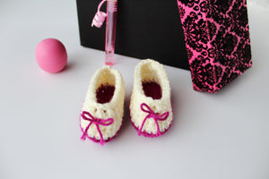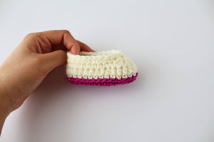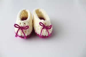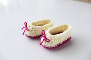 These sweetheart booties are made for babies 0-3 months old. They can be made in one piece using just one color if you like, or you can try out different combinations for the sole and the top of the booties. The little bow on the front of these booties is just a spare length of matching yarn that I tied around the stitch post, but you can customize these any way you like. Or, you could even add little crochet roses or a pretty button to finish them off.