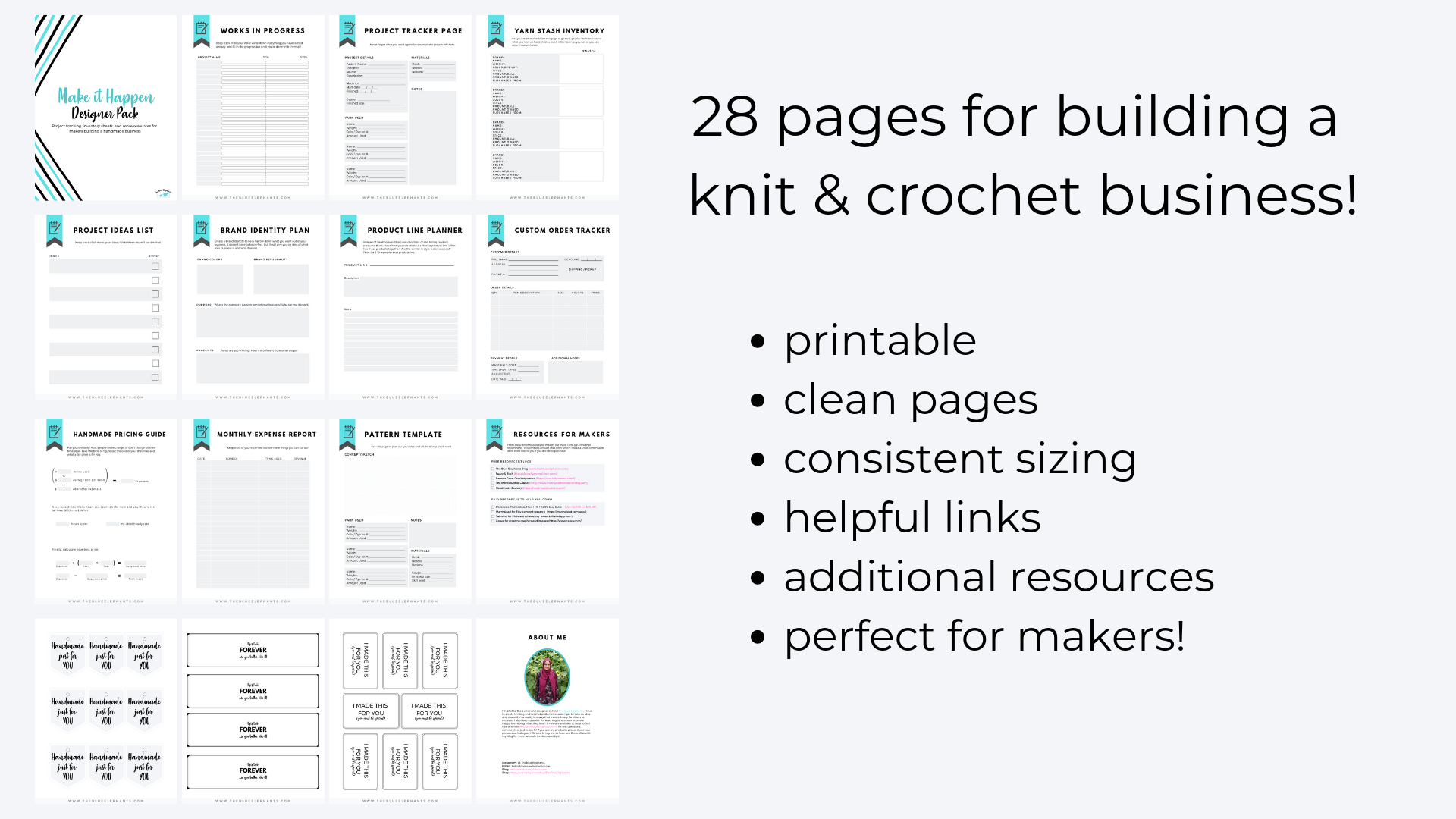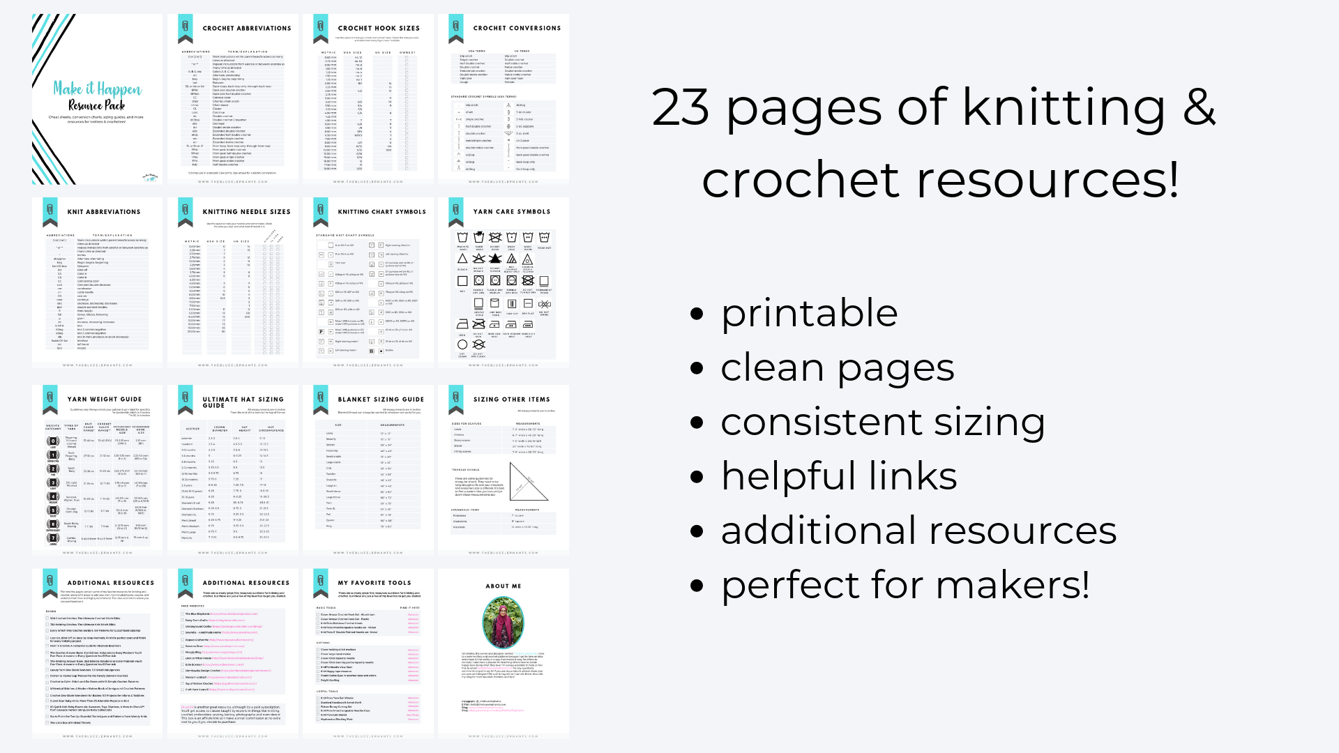 The Make it Happen: Resource Pack is the perfect companion for makers, knitters, and crocheters! This knitting and crochet planner is full of printable resource pages, cheat sheets, sizing guides, to do lists, checklists and more to help you organize your crochet supplies. For everyone that's ever had trouble figuring out knit or crochet blanket sizes, how to make a hat fit, or making sense of knitting and crochet abbreviations, conversions, and materials, this Resource Pack has everything you need!